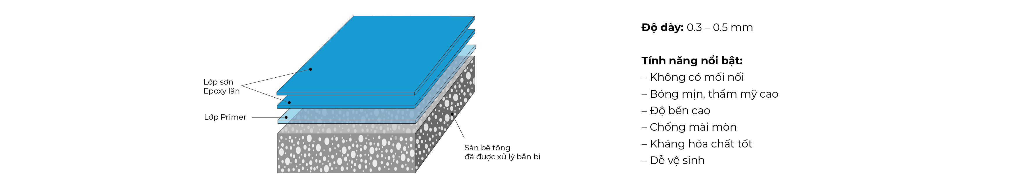 Nhờ cấu tạo nhiều lớp nhưng thi công đơn giản, sàn Epoxy hệ lăn vừa mang lại hiệu quả bảo vệ nền bê tông, vừa đáp ứng tốt các yêu cầu về vệ sinh và tính thẩm mỹ.