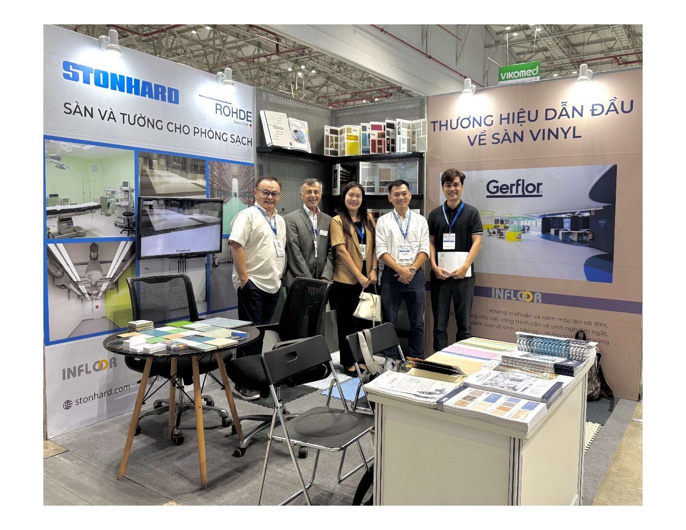 Tại Pharmedi 2025, gian hàng của Infloor được thiết kế tập trung làm nổi bật dòng sản phẩm chủ lực chuyên dùng cho phòng sạch và môi trường y tế là sàn vinyl kháng khuẩn của Gerflor, hệ sơn sàn Epoxy/PU của Stonhard và sơn tường & trần kháng khuẩn của Rohde.