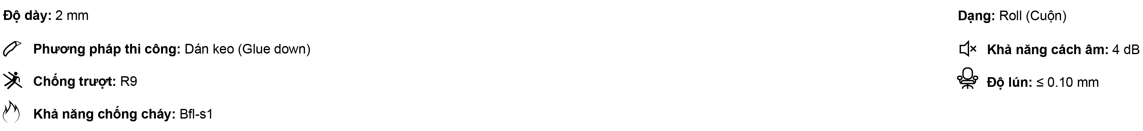 - Sàn Vinyl đồng nhất dạng cuộn, độ dày 2mm, có khả năng chống tĩnh điện vĩnh viễn: 10⁶ ≤ VR ≤ 10⁸ (theo EN 1081).