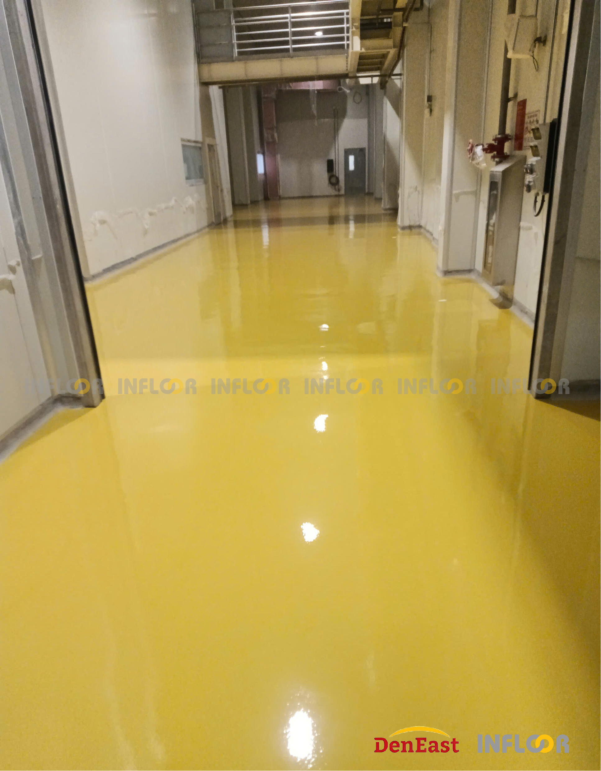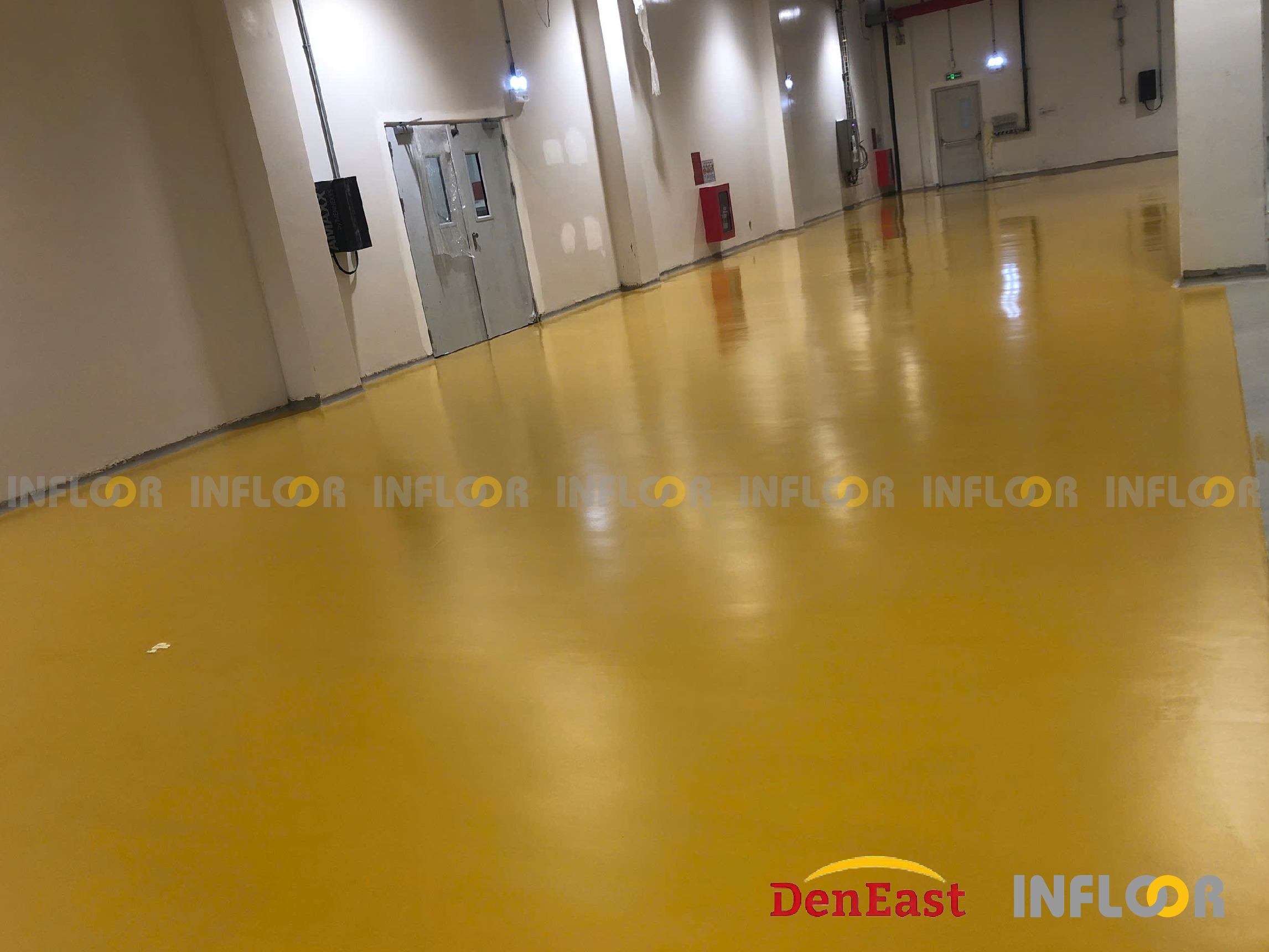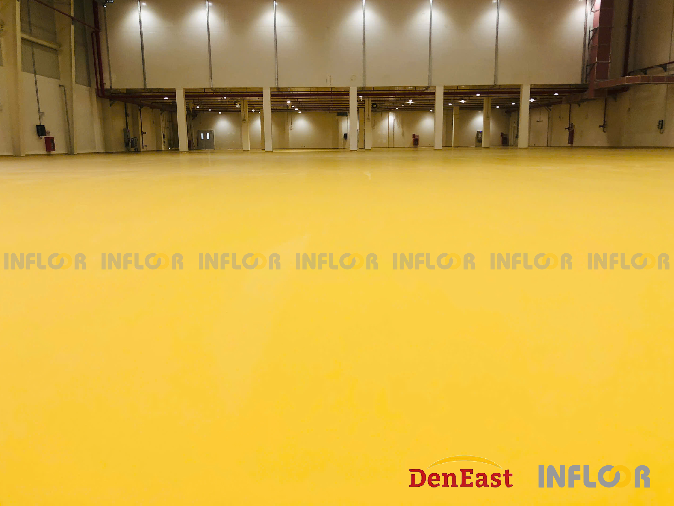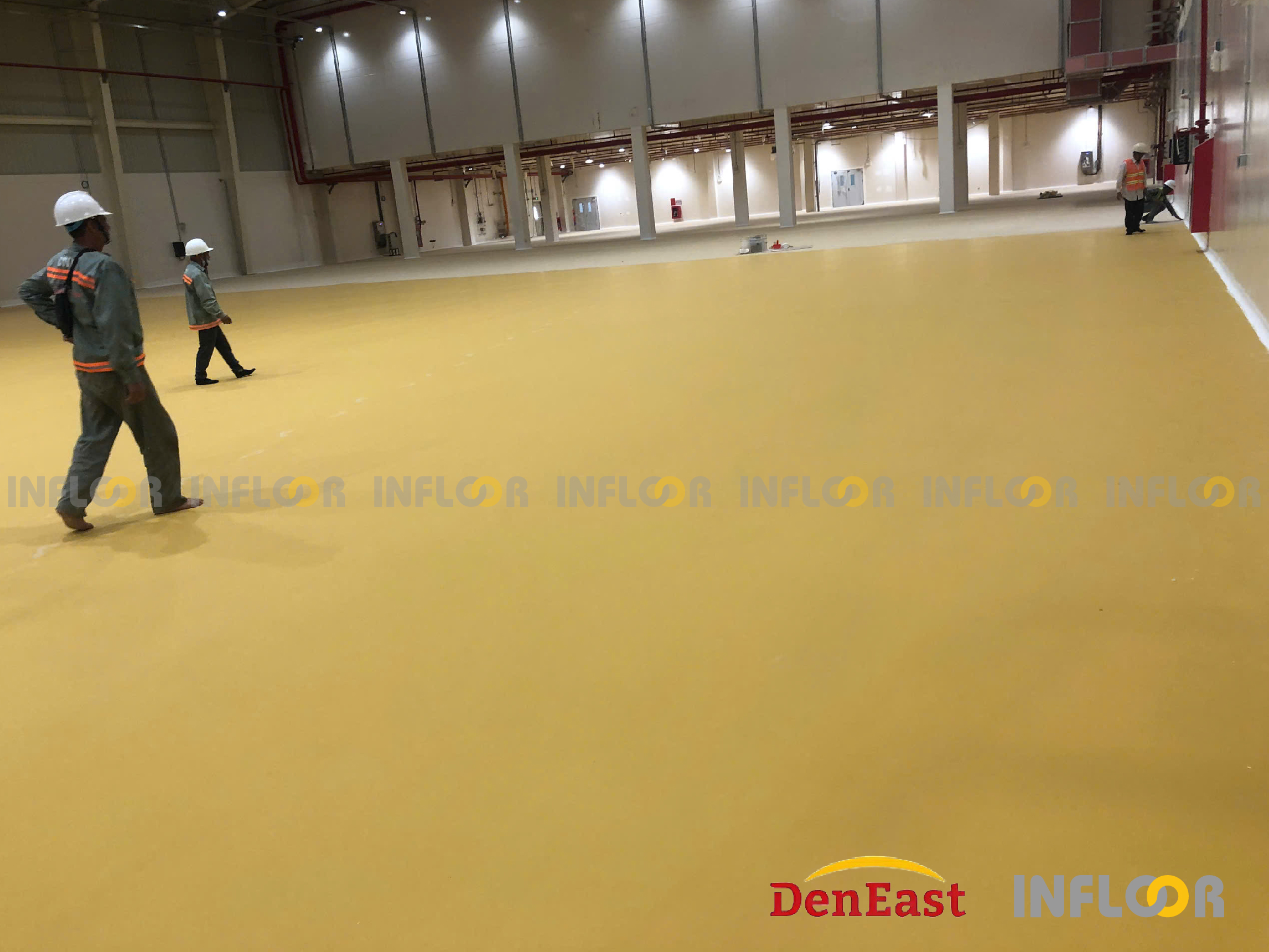 Đặc thù của ngành đồ uống là bề mặt sàn thường xuyên tiếp xúc với nước, các axit hữu cơ từ nguyên liệu thực phẩm và quy trình vệ sinh bằng nước nóng gây sốc nhiệt mạnh. DenEast đã tiếp tục tin tưởng lựa chọn giải pháp sàn Polyurethane (PU) chuyên dụng do Infloor cung cấp và thi công cho các khu vực trọng yếu trong nhà xưởng.