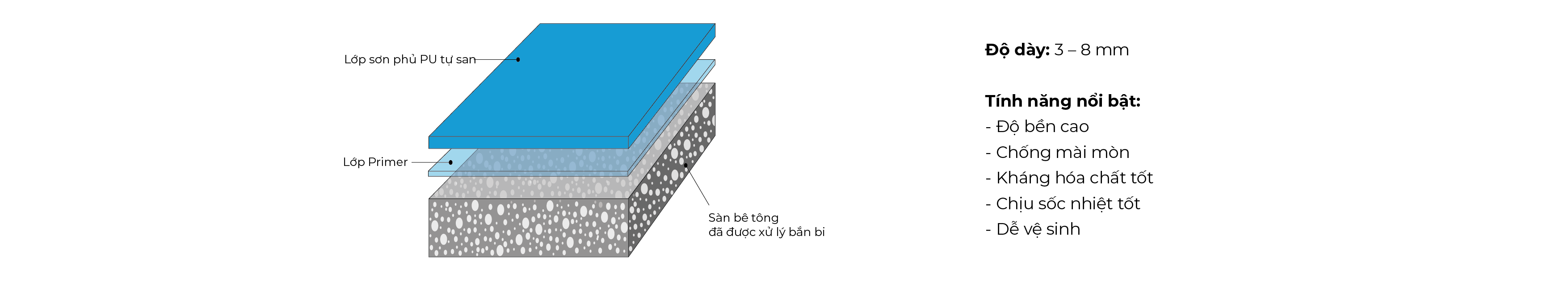 Lớp sàn đặc chắc giúp tăng khả năng chịu tải trọng, kháng mài mòn, đồng thời chống thấm và kháng hóa chất mạnh mẽ. Nhờ tính năng ưu việt này, sàn PU hệ tự san đặc biệt phù hợp cho các khu vực cần độ bền cao và vệ sinh tuyệt đối như nhà máy dược phẩm, thực phẩm, kho lạnh, phòng sạch và các môi trường sản xuất hiện đại.