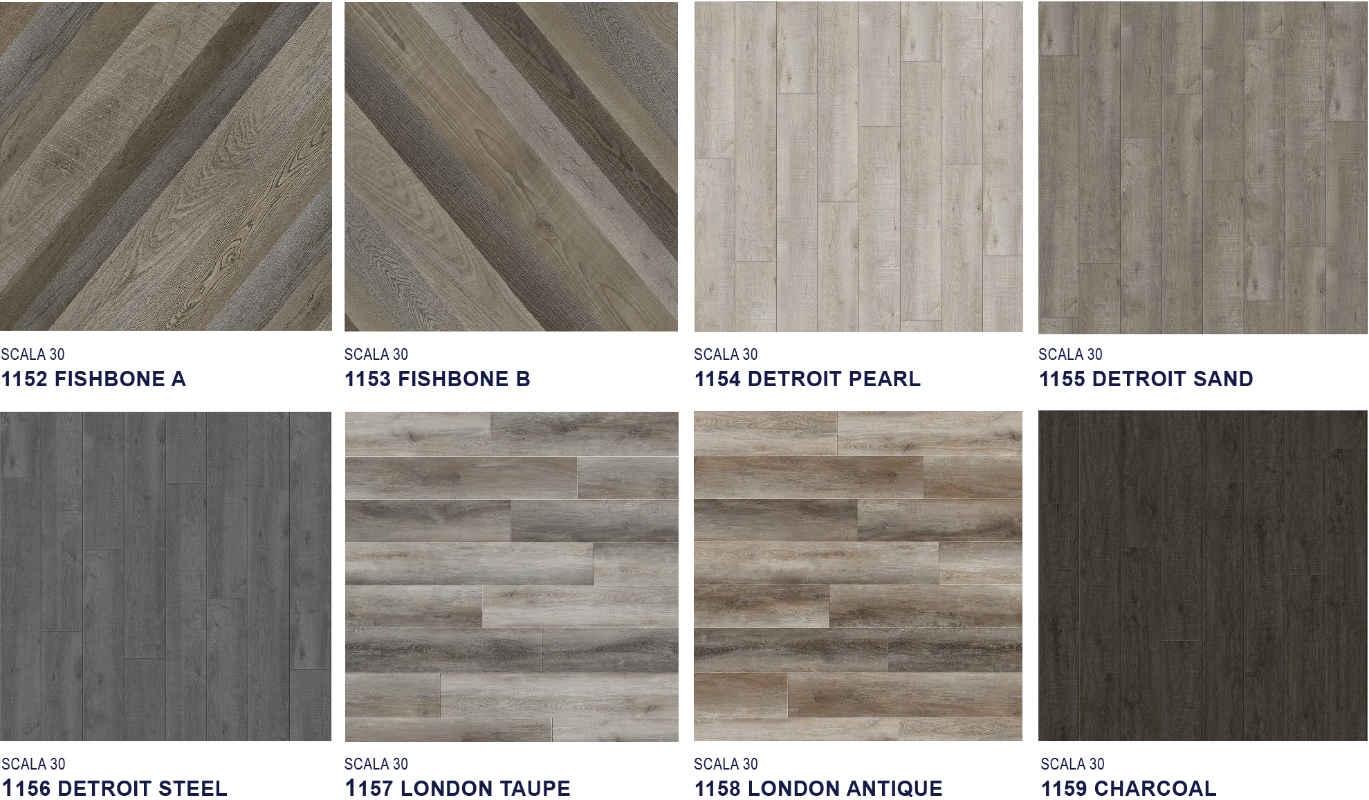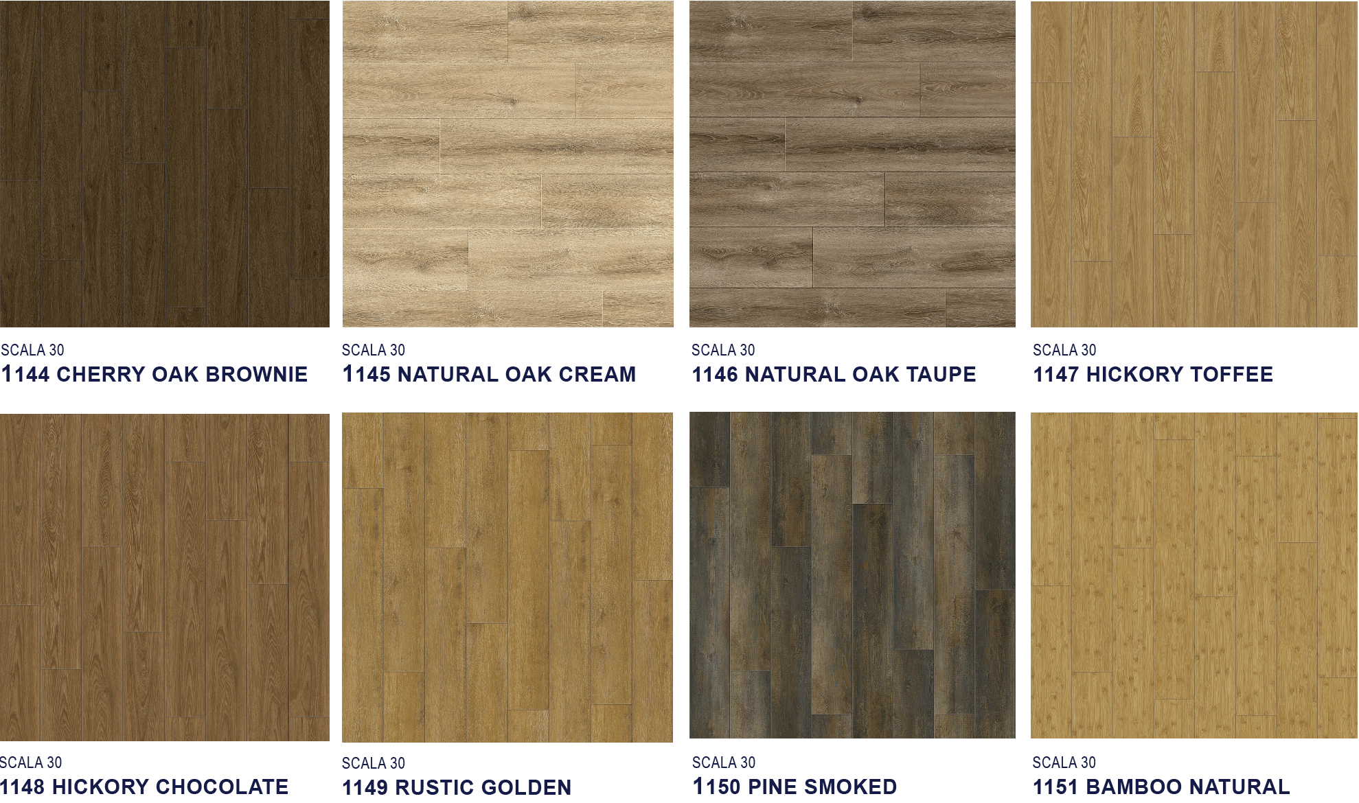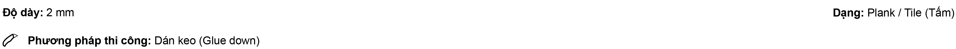 - Sàn vinyl Scala có dạng tấm LVT có cạnh vát nhỏ, độ dày tổng thể 2mm, xử lý bề mặt PUR+ giúp chống trầy và làm sạch tốt.