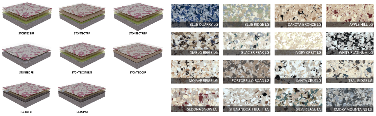 Stontec là hệ sàn Epoxy/PU được phủ rắc thêm lớp vảy flake với đa dạng lựa chọn về màu sắc và lớp hoàn thiện. Bề mặt sàn linh hoạt từ nhám nhẹ chống trơn trượt đến trơn nhẵn dễ vệ sinh, phù hợp với nhiều nhu cầu sử dụng khác nhau.